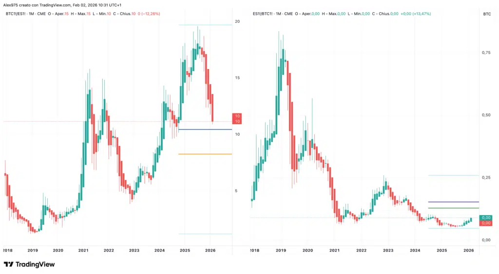 In allegato riportiamo due rapporti tra S&P 500 e Bitcoin per capire se il capitale si sposta verso la speculazione o verso la conservazione. Il rapporto BTC/SPX misura la forza relativa di Bitcoin rispetto all’azionario. Se sale, Bitcoin sovraperforma lo S&P 500, indicando una fase “Risk-On“. È lo strumento principale per i trader per capire dove fluisce la liquidità speculativa.