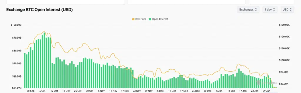 Focalizzandoci sul dietro le quinte del grafico di Bitcoin, analizziamo l’andamento dell’open interest dei Futures BTC, mostra una fase di forte deleveraging. Dai massimi di ottobre sopra 90 miliardi si scende verso 51 miliardi. Prezzo e open interest in discesa indicano chiusura di posizioni, non aumento di short. I recenti rimbalzi non sono accompagnati da nuova leva.
