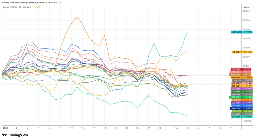 Hyperliquid vola con un +46% seguito da Canton con un +25,80%. A scalare, tutte le altre sono in rosso a partire da Tron con un -0,40% per chiudere con Zcash al -44%.