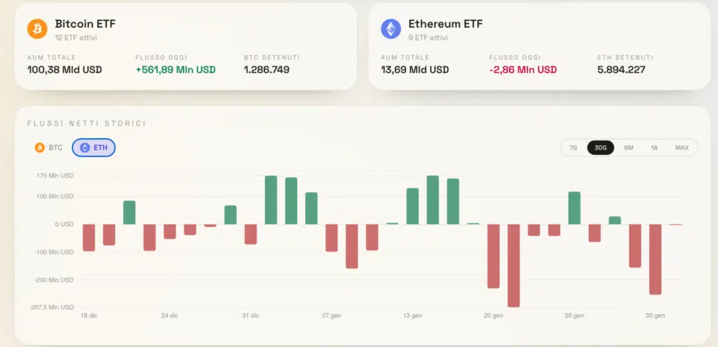 Ieri, Bitcoin ha ripreso ad attirare capitali, con un afflusso giornaliero di 561,89 milioni di dollari che porta il patrimonio totale gestito (AUM) a quota 100,38 miliardi di dollari. Complessivamente, gli ETF detengono oggi 1.286.749 BTC.