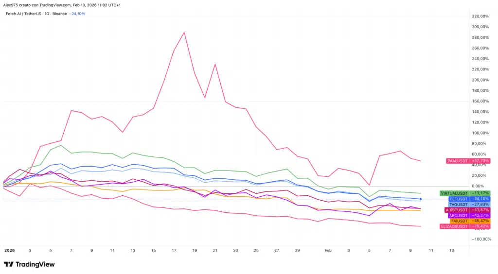Tra i principali token “puri” del settore AI, per market cap, da inizio 2026 si registra un unico rialzo degno di nota, quello di PAAL AI, con un +47%, come si può osservare dal grafico allegato. Tra i principali, Fetch.ai registra un -23%, mentre Virtuals Protocol segna un –13%, dopo che però nel 2025 aveva chiuso con un –83%. Bittensor si attesta a –28%. Il peggiore è ElizaOS, nata dal rebranding di Ai16z, che sta collassando con un -75%.
