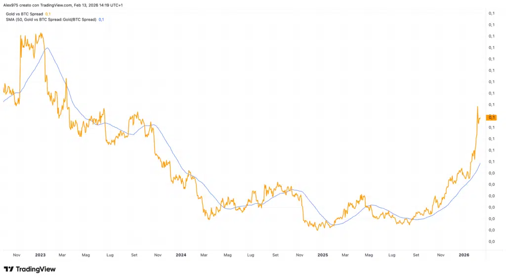 Anche lo spread Gold/BTC conferma questa dinamica. Osservando il grafico allegato, il rapporto è salito vertiginosamente sopra la SMA 50 nell’agosto del 2025 segnalando l’avvio di un trend che sta portando ad una sovraperformance dell’oro.