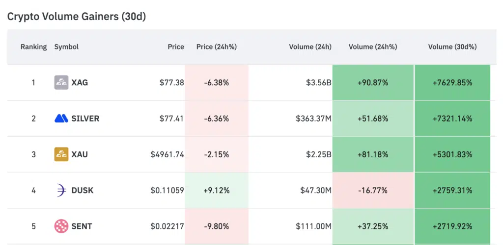 Nella classifica “Crypto Volume Gainers (30d)” spiccano XAG (argento) e XAU (oro), con un incremento dei volumi a 30 giorni rispettivamente del +7.629% e +5.301%.