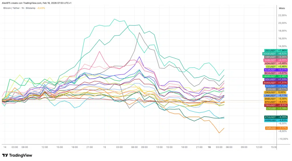 Le crypto hanno illuso con rialzi partiti venerdì, proseguiti sabato e anestetizzati ieri fino alla contrazione del primo pomeriggio. Come si può osservare sul grafico 1H dall’andamento da mezzanotte del 14, si scorge chiaramente il movimento e l’ultima fase di contrazione di ieri. Restano in positivo ZCash a +8%, Dogecoin a +6,50% e +5% a scalare il resto del comparto, mentre BTC ed ETH sono in negativo. La forza continua a mancare sia tra le top 20 sia sulla lunga serie di altcoin, con più rialzi nelle ultime 24 ore per Bittensor e Stable.
