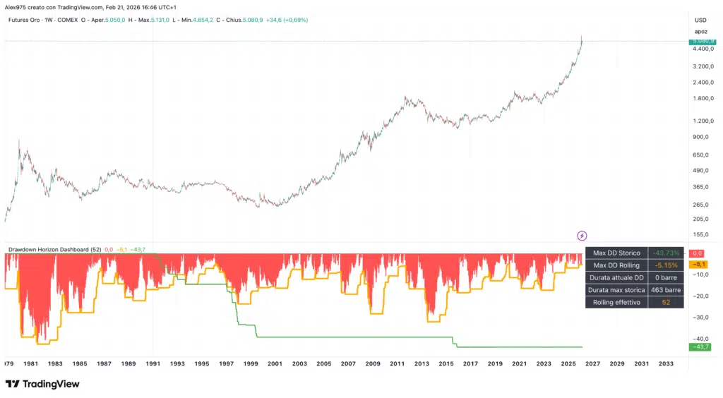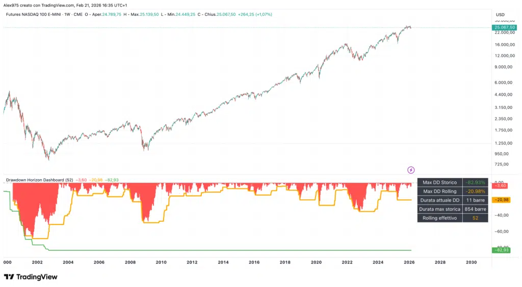 Sul grafico allegato c’è una tabella con Maximum Drawdown Storico, che misura la peggior perdita percentuale mai registrata dal massimo assoluto al minimo successivo sull’intera serie. Il Drawdown Rolling, calcolato su 52 settimane, che valuta invece la perdita massima nel periodo considerato. Si usa su 52 settimane perchè rappresentano un ciclo standard di mercato e consentono di confrontare il rischio ricorrente nel tempo.