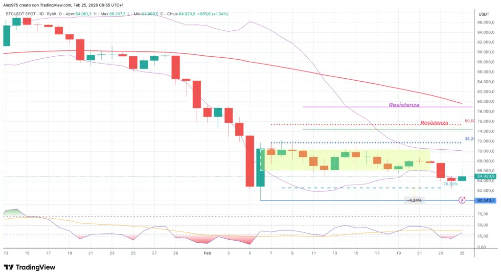Attualmente Bitcoin (BTC) quota 65.240 USDT e ieri ha chiuso con una contrazione del -0,90%. A febbraio registra un -17%, mentre da inizio 2026 il rosso si attesta a -25,60%.