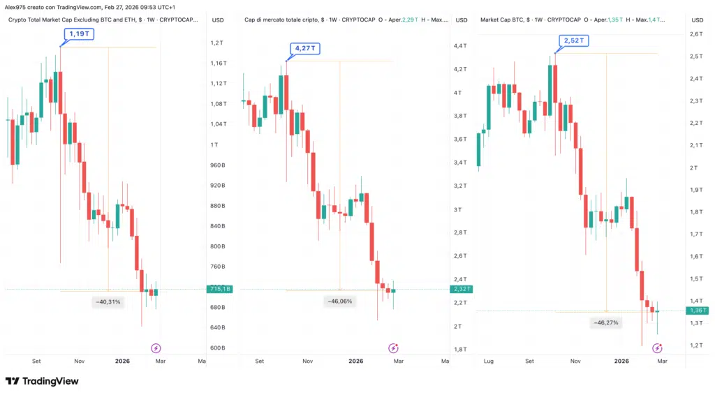 La market cap di Bitcoin ha corretto in misura simile. Mentre le altcoin “OTHERS” hanno perso meno in termini relativi, con un -40% attestandosi ora a 712 miliardi di dollari (TOTAL3).