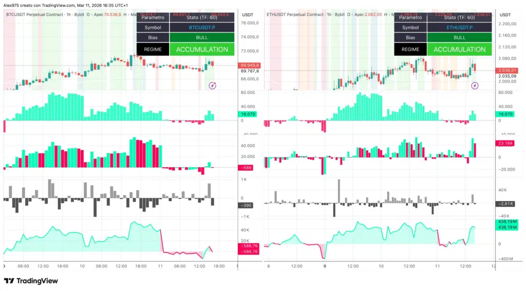La matrice order flow resta in regime ACCUMULATION con bias BULL su entrambi, tuttavia il quadro mostra un deterioramento rispetto alle ore precedenti.