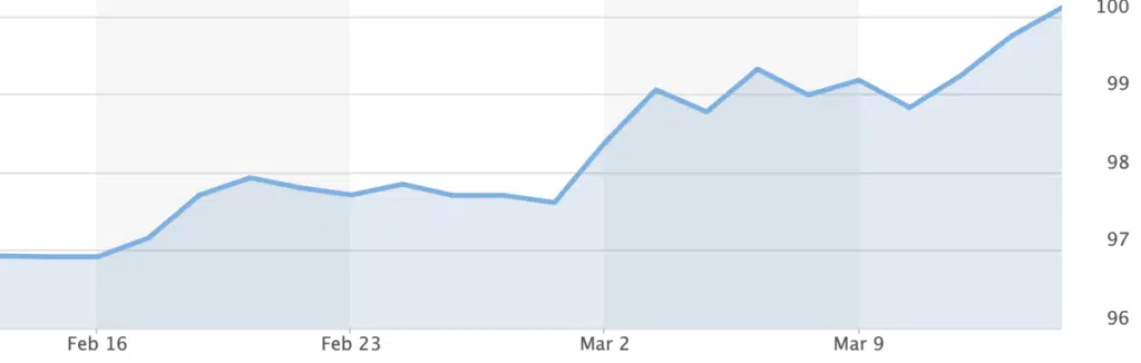Il dollaro USA torna sopra i 100 nel DXY, un indice che ne misura la forza in relazione alle altre principali valute.