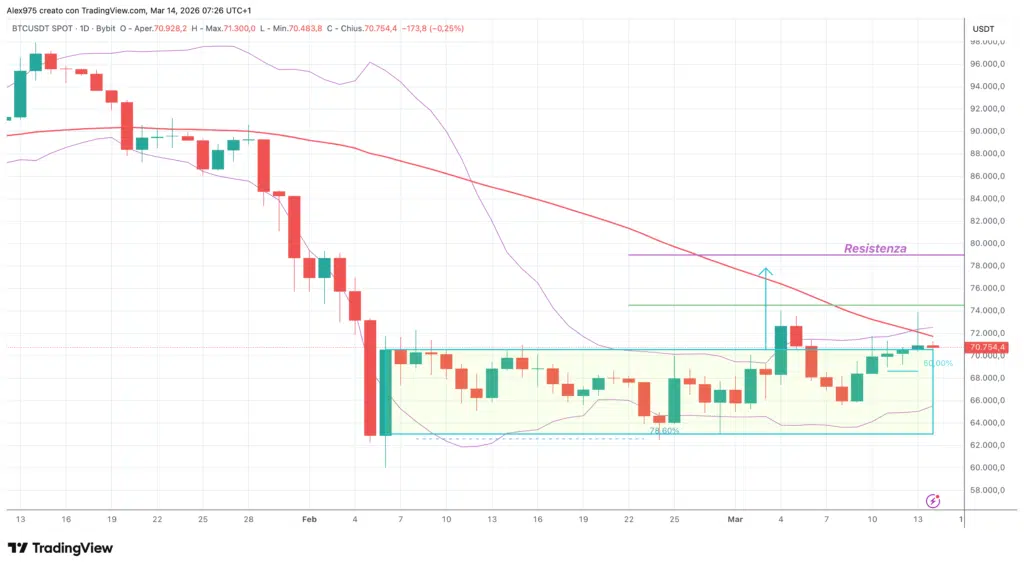 Analizziamo lo scenario di Bitcoin sul grafico daily con una view dal massimo annuale di gennaio a 97.950 USDT. Da qui era scattata la fase di contrazione che ha portato a febbraio al minimo di 60.000 USDT, da dove c’è stato un rimbalzo tecnico. Successivamente, è iniziata la ormai nota fase di congestione, che sta caratterizzando il prezzo Bitcoin e altre crypto da cinque settimane.