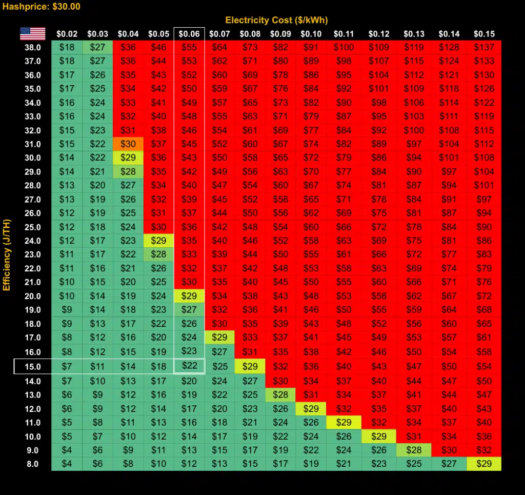 Ancora più interessante un’altra tabella che mette in correlazione l’efficienza delle singole macchine rispetto al prezzo di Bitcoin e dell’elettricità. Mentre a variazione dei costi dell’elettricità l’impatto sarebbe ridotto, un’eventuale correzione importante per $BTC avrebbe degli effetti molto più significativi.