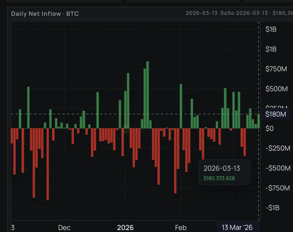 Il 13 marzo si registra un afflusso netto di circa 180 milioni di dollari, segnale di rinnovato interesse istituzionale.