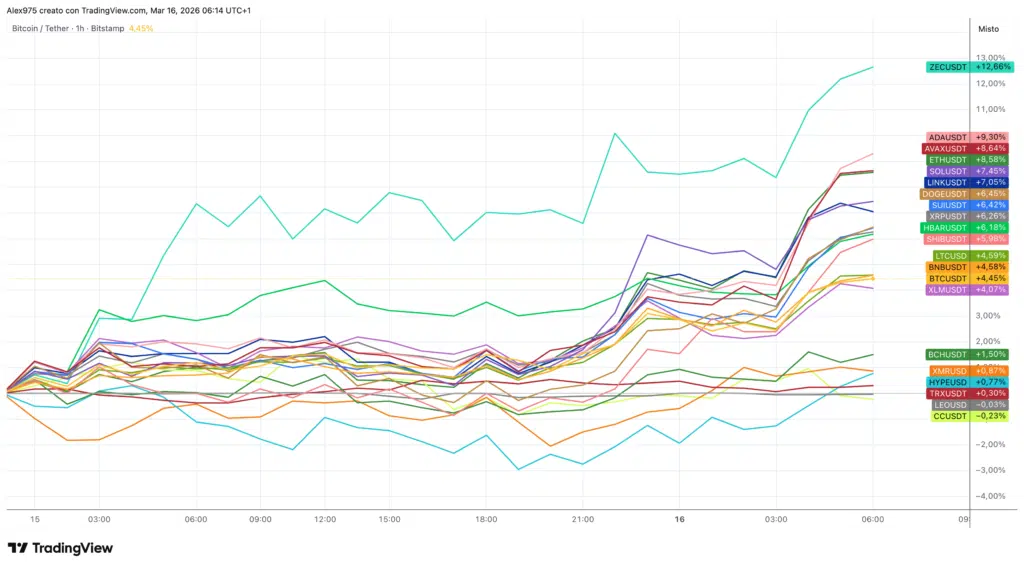 Nella panoramica in allegato sul grafico 1H, riportiamo l’andamento delle crypto Top 20 dalla mezzanotte di domenica mattina, 15 marzo. Dopo una prima fase di rialzo moderato, verso le 21:00 si può notare il primo impulso di accelerazione, seguito da un nuovo impulso alle 3:00 di questa mattina che sta spingendo al rialzo la maggior parte dei token.