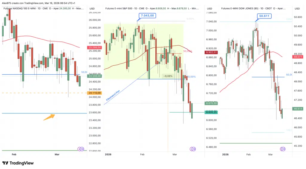 Gli indici azionari restano ancora vicino ai minimi dell’anno, come si può osservare dalla panoramica del grafico allegato con S&P 500, Nasdaq e Dow Jones, che oggi comunque registrano aperture dei futures notturni in positivo. Queste aperture dovranno però essere confermate dalle chiusure daily.