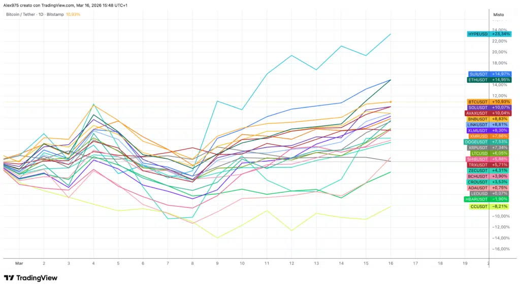 Il migliore resta Hyperliquid, il cui rally è legato al suo ruolo di DEX che ha visto crescere i volumi esponenzialmente grazie anche alla crescita del trade sui contratti sul petrolio. Segue Ethereum con un +15,60%, insieme a SUI, e a scendere una lunga lista di token dove sia XRP che XLM si trovano sostanzialmente a metà classifica.