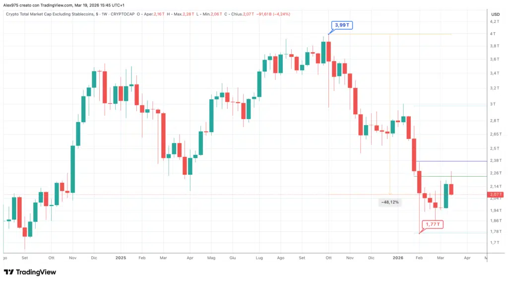 Questo scenario ha fatto scattare in automatico una domanda: ci potrà essere un’altseason, che non vuol dire nuovi ATH, ma una maggior performance delle altcoin rispetto a Bitcoin? In allegato riportiamo il grafico della Total Market Cap Excluding Stablecoins (TOTALS), che misura la capitalizzazione complessiva del mercato al netto delle stablecoin. Escludere USDT, USDC e le altre stable non è un dettaglio tecnico, ma una scelta analitica precisa, perché sono capitali parcheggiati e non esprimono né propensione al rischio né fuga dal rischio.