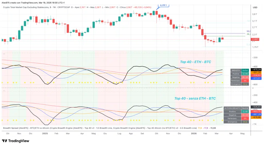 In allegato il grafico mostra due versioni dell’indicatore: la prima include BTC ed ETH nel paniere, la seconda li esclude per leggere la salute delle sole altcoin. I due pannelli raccontano situazioni diverse. Il paniere con BTC/ETH mostra un recupero più avanzato, quello senza BTC/ETH è ancora più debole.