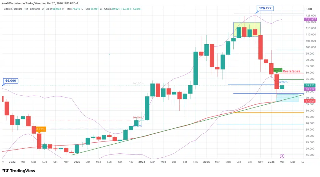 Al momento questo rialzo di Bitcoin (BTC) a marzo lo possiamo considerare un puntino verde all’interno di una leg ribassista che sta durando da sei mesi consecutivi. Sul grafico monthly riportiamo una panoramica dell’andamento del prezzo di BTC, che attualmente quota 70.669 USDT.