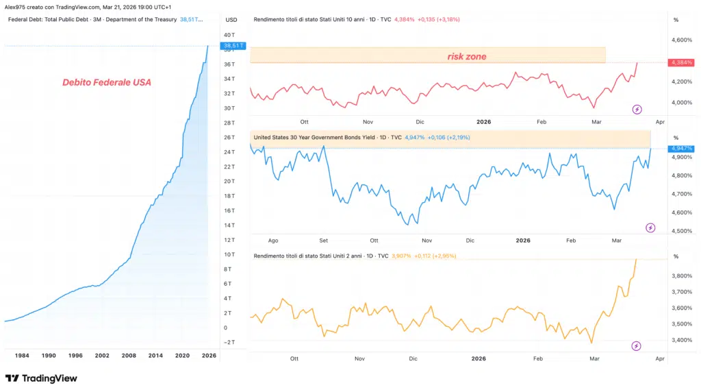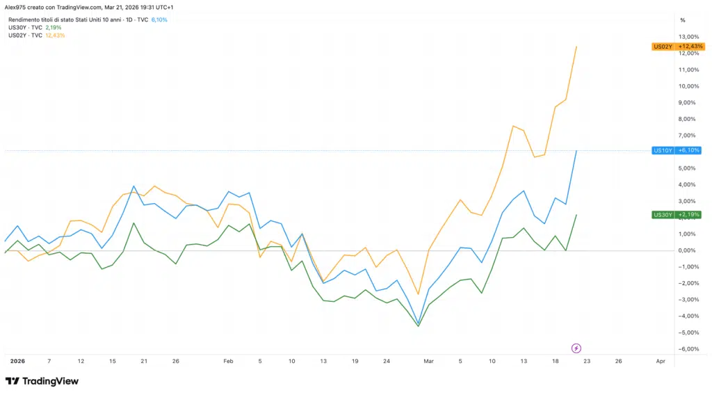 Nel grafico seguente si può osservare la crescita dei rendimenti dei Titoli di Stato USA da inizio anno, dove spicca il +12,43% del 2 anni (US02Y). Il rendimento a 2 anni cresce più del 10 e del 30 anni da inizio 2026: un comportamento anomalo che segnala aspettative di inflazione persistente.