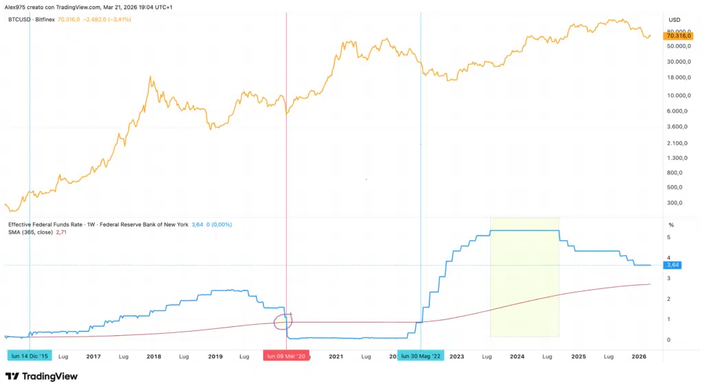 La storia del comportamento di Bitcoin ci mostra un pattern ricorrente. Nel 2020 la Fed tagliò i tassi a zero e BTC esplose da 5.000 a oltre 60.000$. Liquidità a rubinetto aperto, asset di rischio in bull market. Nel 2022 avvenne il contrario. I rendimenti schizzarono dal 1,5% al 4,5% e BTC crollò da 60.000 a 16.000$. Correlazione diretta tra politica monetaria e prezzo, senza ambiguità