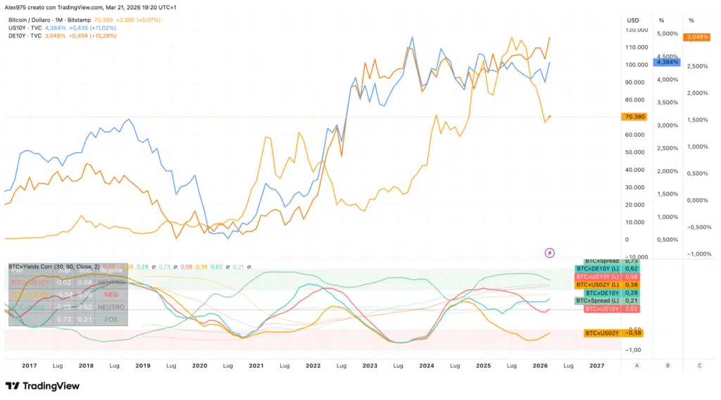 Tuttavia oggi il quadro è più complesso. L’indicatore di correlazione rolling, misura mese per mese, quanto il prezzo di BTC tende a muoversi nella stessa direzione dei rendimenti obbligazionari.