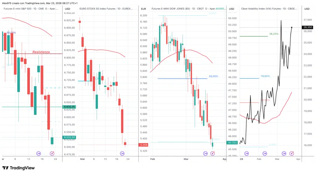 Dal grafico allegato è ben evidente la fase di ribasso sui mercati globali, che ha trovato accelerazione negli ultimi giorni. In questo contesto, l’indice VIX ha accelerato al rialzo e oggi segna già un +3%.