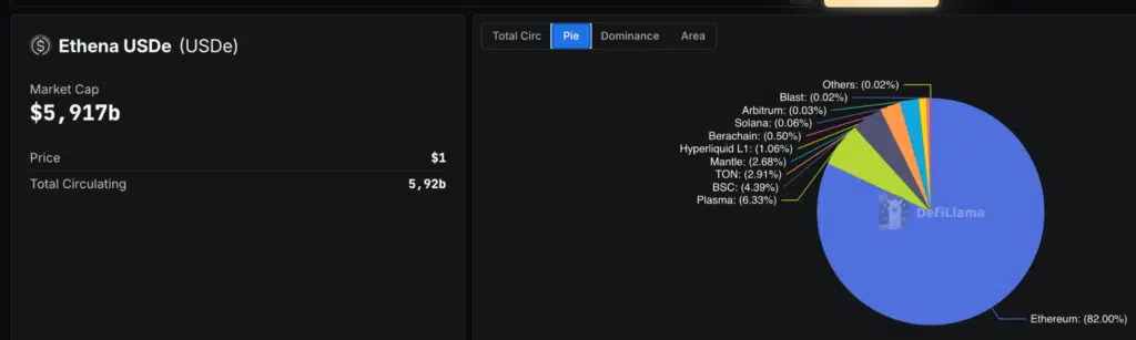 La distribuzione di USDe evidenzia una forte concentrazione su Ethereum, che rappresenta circa l’82% dell’offerta totale. Il market cap è pari a 5,91 miliardi di dollari, con supply in circolazione di circa 5,92 miliardi. Le altre chain hanno un peso marginale, segnalando una struttura ancora poco diversificata, però altamente liquida e concentrata sull’ecosistema principale.