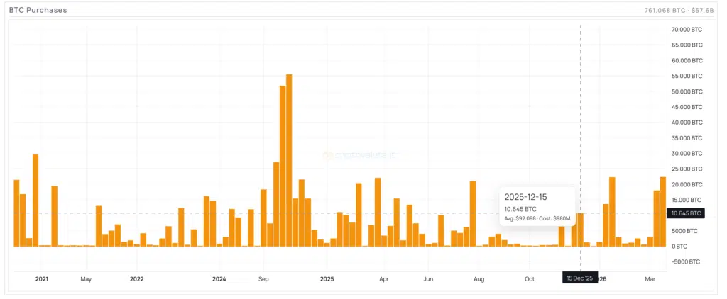 Da quanto tempo non succedeva? Secondo lo stesso storico fornito da Strategy, l’ultima volta che il gruppo ha saltato una settimana per gli acquisti di Bitcoin è stato lo scorso 22 dicembre. Precedentemente era avvenuto anche il 18 e il 25 novembre, segnando però quello che era stato il periodo di massimo rallentamento degli acquisti del gruppo, almeno in epoca recente.