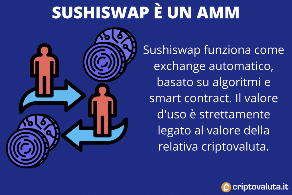 Sushiswap è uno dei progetti più nuovi sul mercato e tra quelli che sono riusciti a conquistarsi un posto al sole, ottenendo inoltre un buon livello di capitalizzazione. Il network è un exchange decentralizzato, che non ha proprietari e che funziona come automated market maker (AMM). Parliamo di un exchange costruito sulla rete di Ethereum e che sfrutta gli smart contract per offrire scambi automatici e la gestione anche dei rate di scambio tra i diversi token.