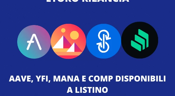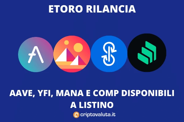 eToro rilancia! La nota cripto-piattaforma aggiunge quattro nuovi token al suo listino, pescando tra i progetti più promettenti del mercato. Una mossa inaspettata, con eToro permette di fare trading e investimenti già da adesso su Compound, Mana di Decentraland, yearn.finance e AAVE, tutte criptovalute oggetto di costanti analisi ed approfondimenti su Criptovaluta.it.
