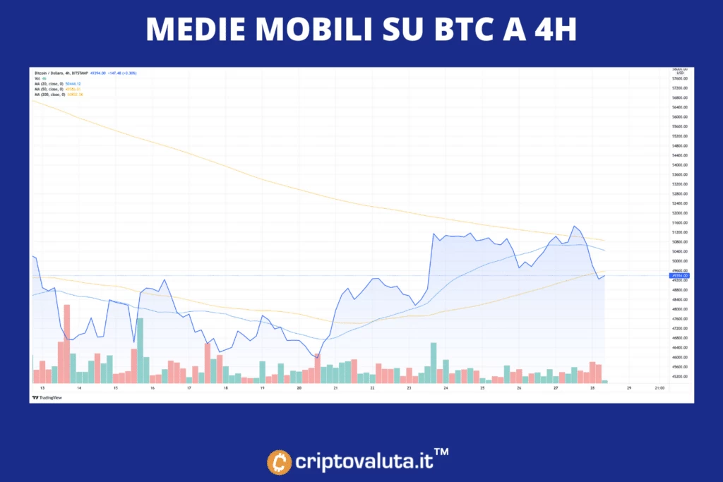 Anche le medie mobili, tanto sull’ora quanto sulle 4 ore non sembrano offrire delle chiavi di lettura utili per il futuro di brevissimo periodo di $BTC. Siamo sotto le MA 20, 50 e 200 senza che queste però abbiano esercitato funzione di supporto o resistenza.