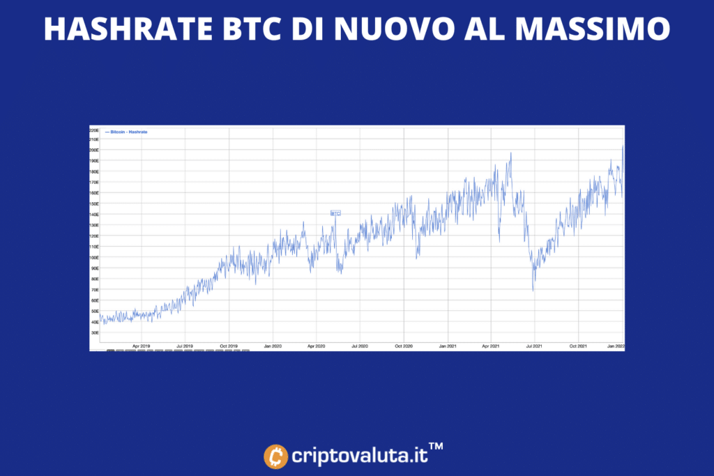 Questa notizia arriva in una fase di mercato di movimenti laterali, mentre tutte le buone notizie arrivano, se vogliamo, dall’esterno. C’è stato un nuovo record per quanto riguarda l’hashrate che macina numeri per garantire la sicurezza e il funzionamento dell’intero network.