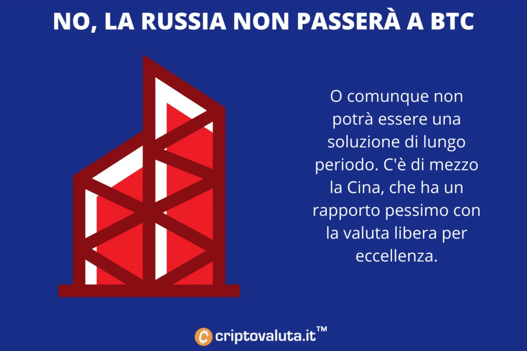 E questo è quanto è stato fatto diffondere dai più alti organi del governo russo. Il popolo di Bitcoin, talvolta eccessivamente suggestionabile, ci ha letto una sorta di sponsor per $BTC. Permetteteci di andare per l’ennesima volta controcorrente: Bitcoin avrebbe già enormi difficoltà ad essere una toppa provvisoria per la terribile situazione russa in termini finanziari, figuriamoci sul medio e lungo periodo.