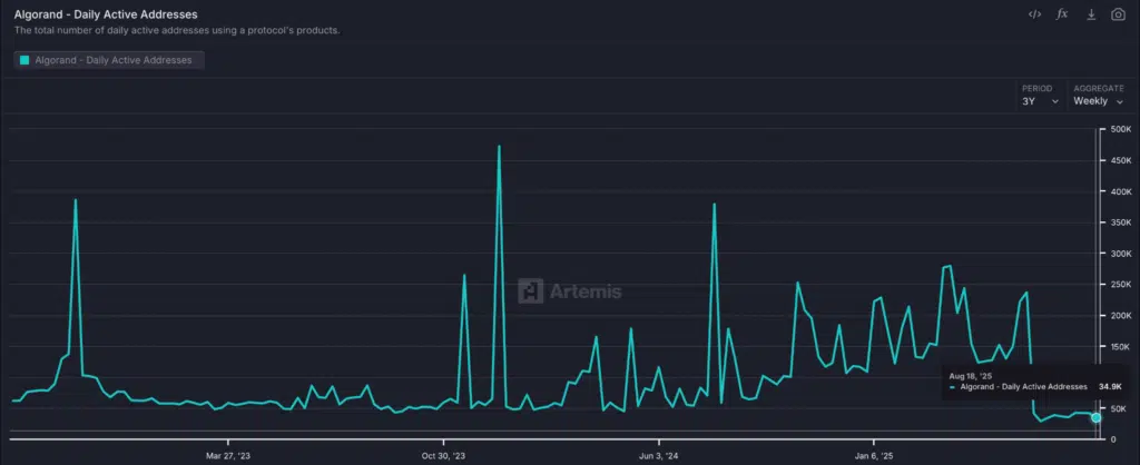Negli ultimi tre anni Algorand ha mostrato un andamento altalenante degli “daily active addresses” attivi giornalieri, con picchi improvvisi oltre 400.000 e successivi cali repentini. Dal 2024 si è osservata una fase più stabile, con valori medi compresi tra 100.000 e 250.000 indirizzi. Tuttavia, nell’estate 2025 l’attività è crollata drasticamente: al 18 agosto si registrano soltanto 34.900 indirizzi attivi. Questo segnala un indebolimento della rete e una contrazione nell’utilizzo reale del protocollo, nonostante i precedenti picchi operativi.
