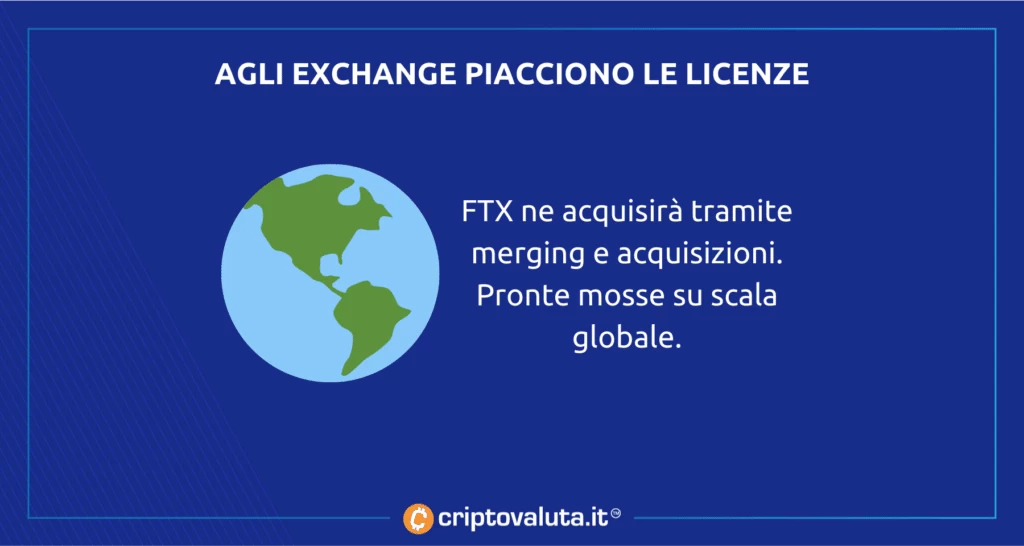 Cosa sta accadendo ora? Semplice: tutti gli intermediari di un certo livello si stanno guardando intorno a caccia di licenze che ne normalizzerebbero le attività stato per stato. Lo abbiamo visto con Binance, con più di un piede ormai in Italia, in Francia e anche in Germania. Lo abbiamo visto con Coinbase che si è quotato in borsa negli USA e con ogni probabilità lo vedremo anche con altri intermediari.