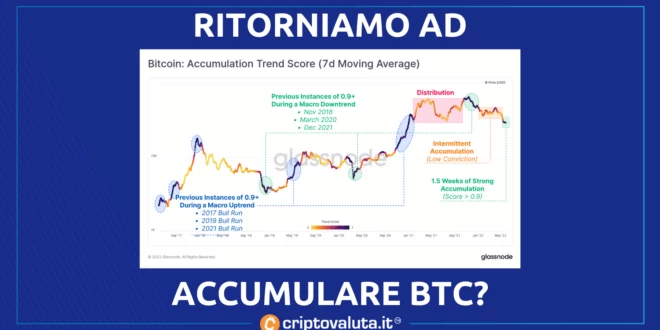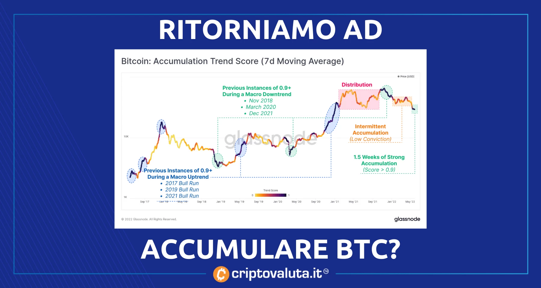 Ed è un dato importante quello che viene fuori dall’accumulation trend score, un indice elaborato da Glassnode stessa che dovrebbe segnalare i comportamenti di coloro i quali appunto accumulano Bitcoin. Nonostante la fase calante – o forse sarebbe il caso di dire grazie alla stessa – avrebbero approfittato dei prezzi molto convenienti a mercato per mettere le mani su altre porzioni di Bitcoin, così da aumentare le loro dotazioni a prezzi che sono meno della metà di quelli di picco.