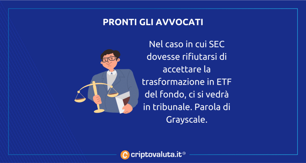 Grayscale però sarebbe decisa a fare molto più sul serio, e dopo aver assunto uno degli avvocati dell’amministrazione Obama si è detta pronta ad adire le vie legali contro SEC nel caso di diniego. Un diniego francamente inspiegabile anche se dovessimo metterci dalla parte di SEC e che sta ritardando uno dei potenziali vettori di crescita di prezzo di $BTC.