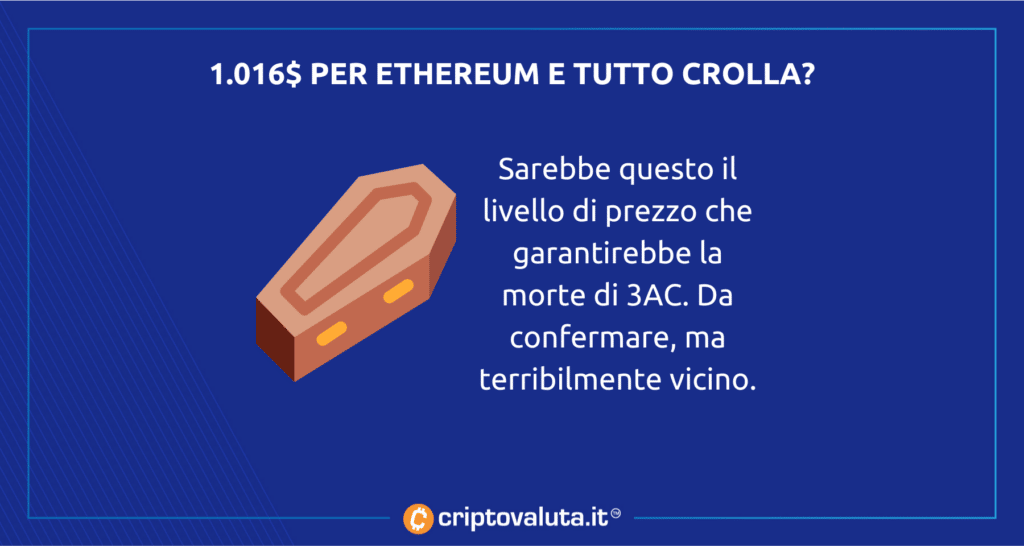 Secondo, ancora una volta, pareri di specialisti che stanno circolando su Twitter, siamo davanti ad una situazione molto particolare per quanto riguarda 3AC in relazione al prezzo di Ethereum. Se dovesse scendere sotto i 1.000$ potrebbe significare la parola fine per 3AC e la morte di ogni velleità di recupero.