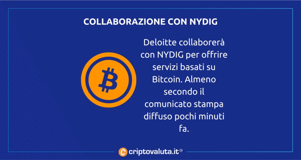 Secondo un comunicato stampa diffuso pochi minuti fa Deloitte, una delle società di consulenza più importanti del mondo, avrebbe stretto un accordo con NYDIG per offrire dei servizi di banking legati al mondo di Bitcoin.