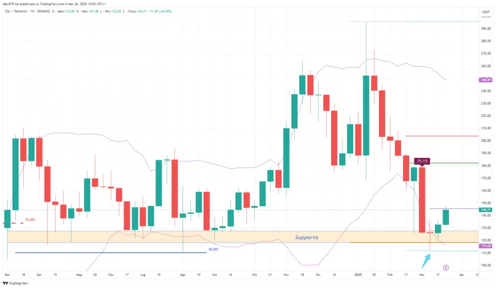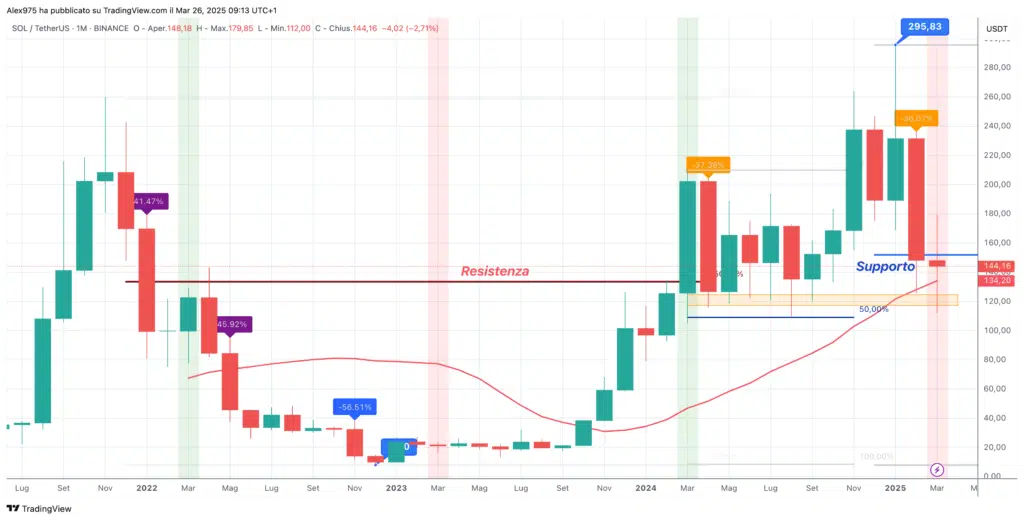 Nel 2024, è stato toccato un massimo annuale in Marzo a 210,90 USDT, polverizzato a Novembre con il nuovo massimo a 264,39 USDT per essere risuperato dall’ATH di Gennaio 2025. Da qui è iniziata una nuova fase discendente con febbraio chiuso in rosso del -36% e il prezzo di SOL che ha rotto il supporto principale più volte indicato nelle nostre analisi.
