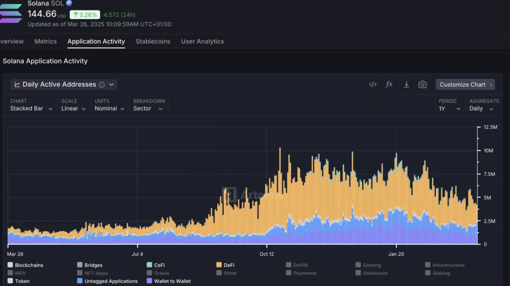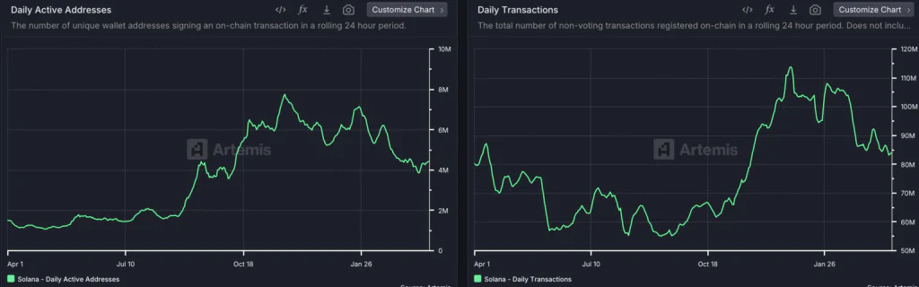 Nel 2025 i dati on-chain mostrano un rallentamento evidente per Solana. Il numero di Daily Active Users è sceso dai 6,9 milioni registrati a fine gennaio a circa 2,9 milioni a ottobre, evidenziando un calo di oltre il 55%. Questo ridimensionamento riflette una riduzione dell’attività retail e del traffico legato a NFT e DeFi.