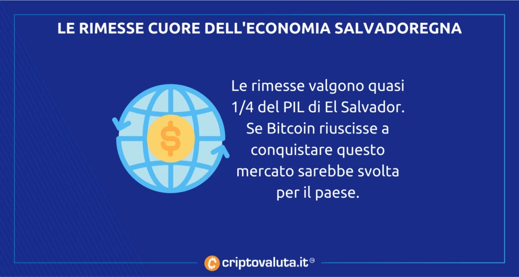 I nostri lettori ricorderanno di quanto disse Nayib Bukele, che in relazione all’adozione di Bitcoin da parte della popolazione aveva indicato nelle rimesse dall’estero uno dei casi d’uso più importanti. Rimesse dall’estero che ad oggi contano per circa 1/4 del prodotto interno lordo del Paese e che continuano a crescere. Rimesse che devono passare da circuiti come quello di Western Union, che sono molto costosi e che vanno dunque ad impattare in modo considerevole su quanto la popolazione effettivamente riceve da parte di chi è emigrato.