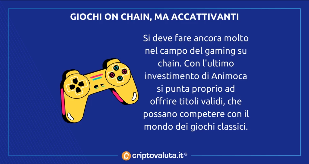 Chi invece non ha bisogno di tutor in questo senso è Animoca Brands, che continua a spendere cifre enormi per lo sviluppo del gaming su chain, con investimenti allocati in 340 progetti differenti.