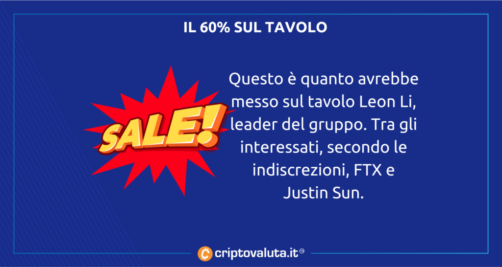 L’interesse di Leon Li sarebbe quello di far entrare nel gruppo, tra le altre cose con una quota di maggioranza, azionisti forti che siano in grado di portare il gruppo alò suo successivo step di crescita, motivo per il quale abbiamo avuto una reazione così veemente anche in termini di valore di mercato per il token collegato all’exchange stesso.