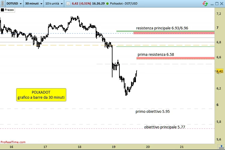 Il grafico a barre daily evidenzia come Polkadot si sia praticamente rimangiato, nel corso del ribasso delle ultime quattro settimane abbondanti, quasi l’intero rialzo che era salito nel corso del mese precedente, iniziato proprio dai già menzionati minimi di quota 6.01. Il fatto che le quotazioni si stiano avvicinando all’area di reazione posta appena sopra alla linea dei 6.00 dollari lascia aperta la possibilità che, già nel corso di questa settimana, possa cominciare a svilupparsi un nuovo tentativo di recupero.