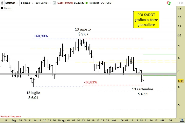 In sostanza, il mercato ha – almeno per il momento – interrotto la discesa che sta proseguendo in accelerazione dal picco relativo del 10 settembre, e lo ha fatto quando ormai le rilevazioni erano giunte ad un soffio dagli importanti minimi del 13 luglio scorso registrati a quota 6.01, il punto più basso degli ultimi due anni. Mentre sono le ore 16.12 di lunedì 19 settembre, DOT viene scambiato a 6.38 dollari, in calo del -0.93% su base giornaliera.