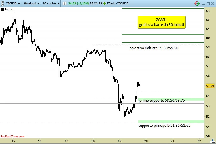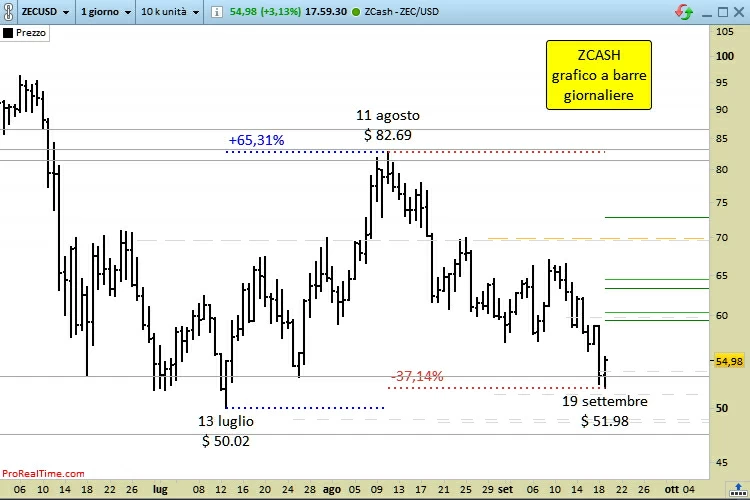 A partire da tali minimi si è innescato un tentativo di recupero che risulta ancora in corso mentre scriviamo, e che tecnicamente possiede le caratteristiche idonee per trasformarsi in un movimento rialzista più ampio. Nel frattempo, quando sono le 17.59 di lunedì 19 settembre, Zcash scambia a 54.98 dollari, con un guadagno del +3.13% su base giornaliera.