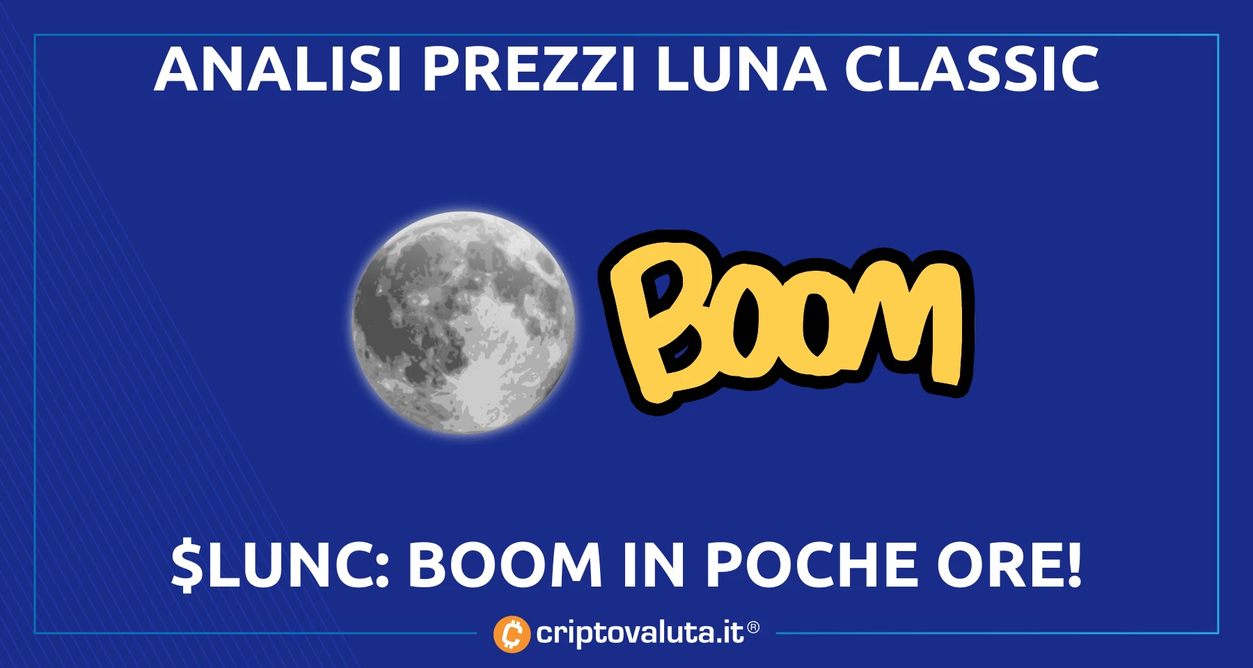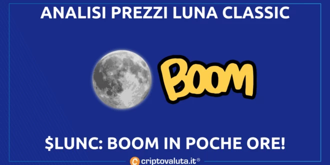 Dal punto di vista grafico il boom odierno di LUNC è probabile che vada ad esaurire la forza propulsiva della news, a meno che la decisione di Binance, non venga ad essere seguita anche da altri primari exchange. Ciò sarebbe nuovo carburante per mandarla “in to the moon”, come piace dire a molti trader della crypto community e suona strano dopo il crash di Maggio.