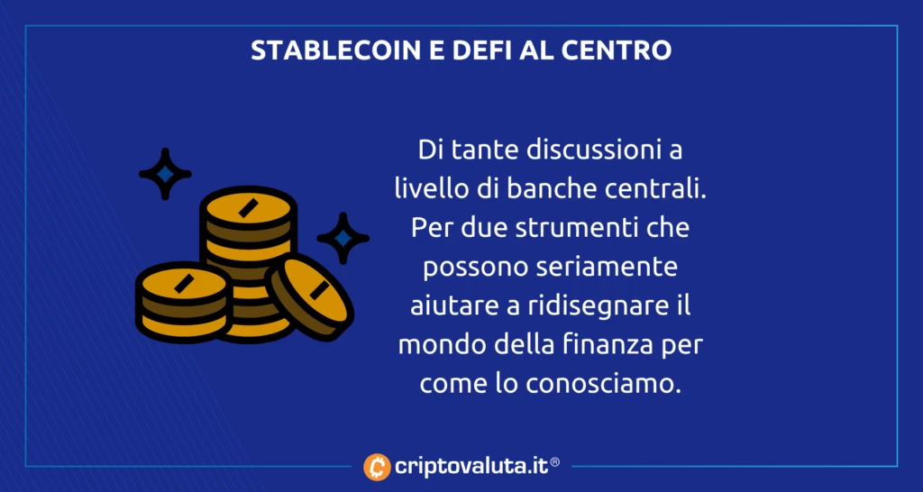 In questi e nei successivi passaggi il presidente della Federal Reserve sembra voler richiamare l’attenzione su stablecoin e casi d’uso: temi che sono già stati discussi nel recentissimo passato, e che di tanto in tanto tornano tornano sui tavoli che contano.