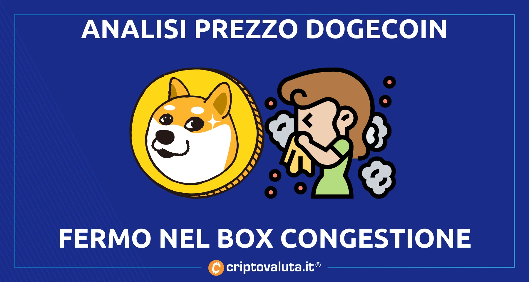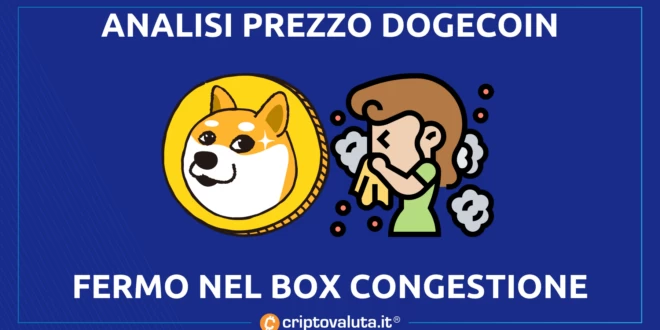 La situazione di lateralità di Dogecoin, l’avevamo già evidenziata nel nostro ultimo articolo di 10 giorni fa, Analisi prezzi Dogecoin | In fase laterale e bassa volatilità. Sostanzialmente non è cambiata in questi giorni successivi, non ci sono stati tweet di Musk che ne hanno “pumpato” il prezzo, che è rimasto all’interno del box di congestione, ben visibile sul seguente grafico weekly. Quello che salta subito all’attenzione è che il prezzo di DOGE è molto vicino alla parte del box, il che fa intuire come la fase di debolezza si stia ancora prolungando.